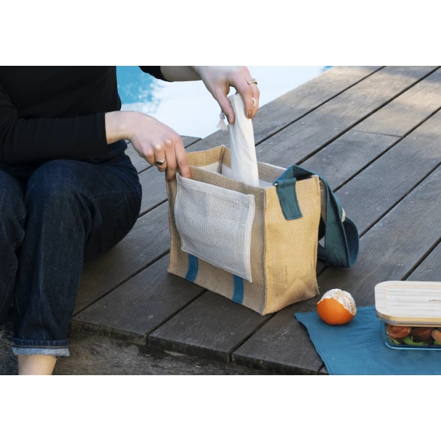 Proposé dans un design sobre et passe partout, Pebbly a su accorder le coté naturel de la fibre de jute à la couleur crème élégante pour son sac déjeuner. Les sangles ainsi que la bandoulière ajustable sont proposées dans une teinte bleue marine pour contraster avec le reste du sac lunch.