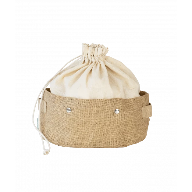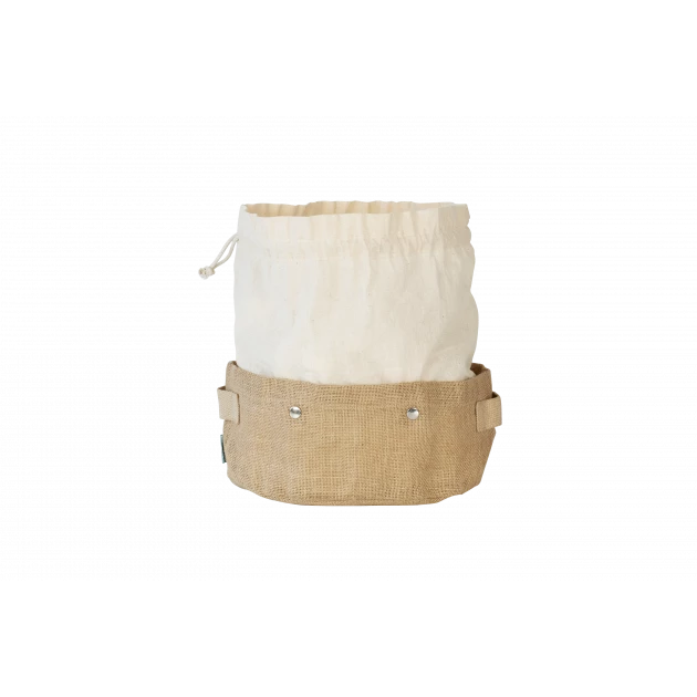Composé d’un panier en jute et d’un sac amovible en coton bio, cette corbeille dispose de poignées robustes pour transporter vos aliments d’une pièce à l’autre. D’une dimension de 27 cm de long et 20 cm de large le panier en fibre de jute est équipé de pressions pour pouvoir y accrocher votre sac en coton bio d’une hauteur de 12 cm.