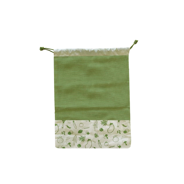 Alternative durable aux sacs jetables en plastique ou en kraft, le sac en tissu est fabriqué en coton biologique et possède une partie supérieure en filet de coton ce qui garantira une meilleure conservation de vos fruits et légumes. Le sac en coton de couleur verte aux motifs originaux est équipé d’un cordon de serrage pour maintenir en place vos divers aliments.